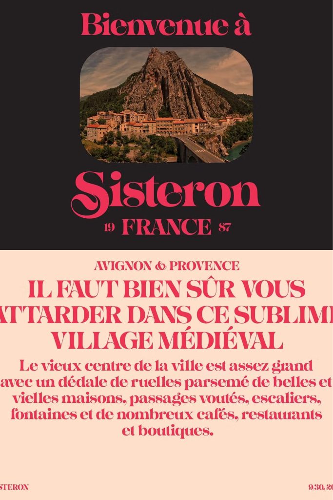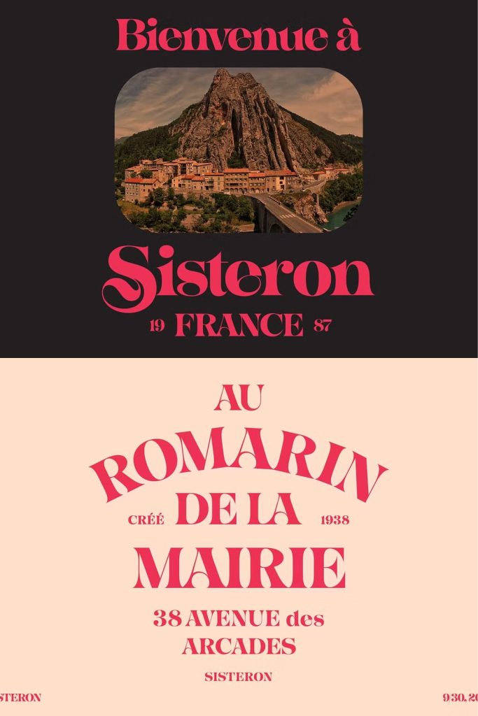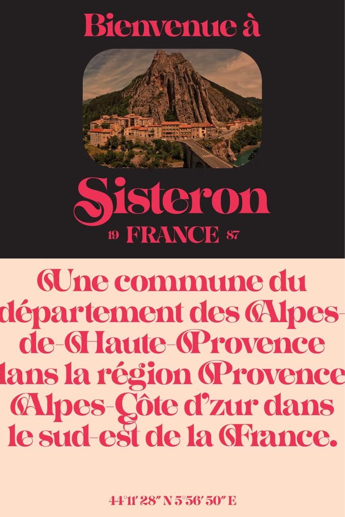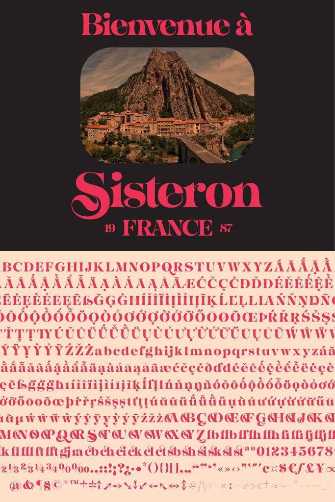 Sisteron is a display font in the Jugendstil style. It has 543 glyphs, including a wide array of alternates, a full set of 26 swash caps, and foreign characters, making it compatible with dozens of foreign languages.