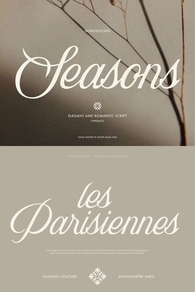 Seasons is an elegant and romantic script that can be used in a wide range of projects such as logo design, wedding invitations, product packaging, apparel design, and more.