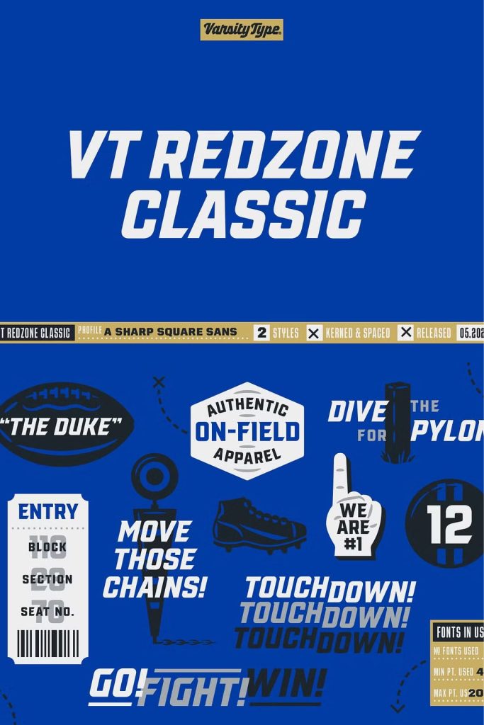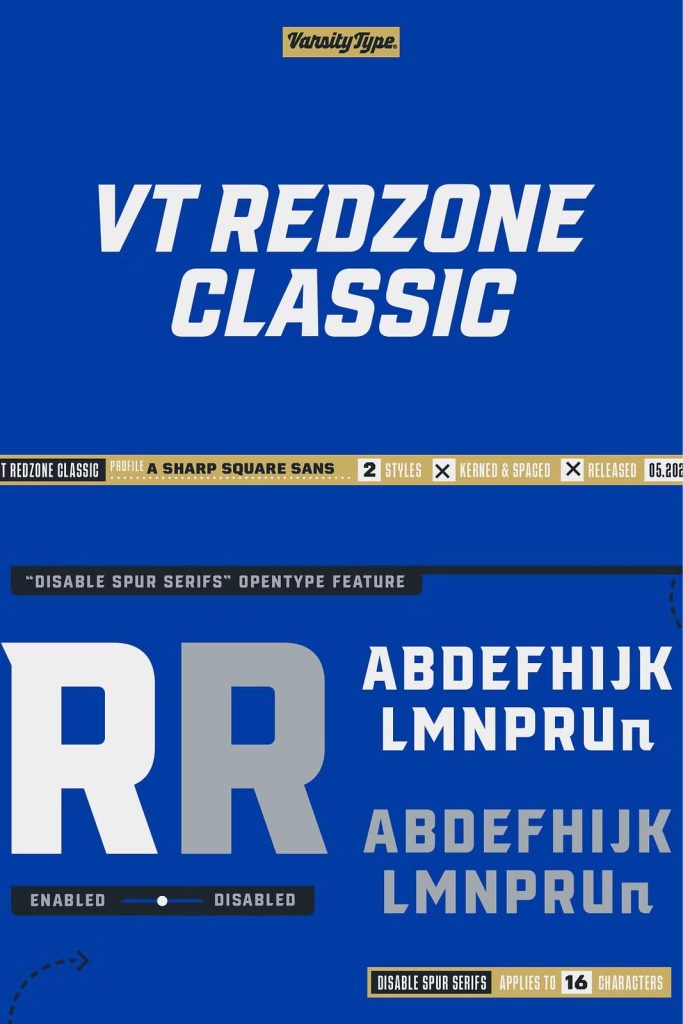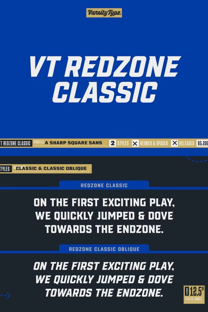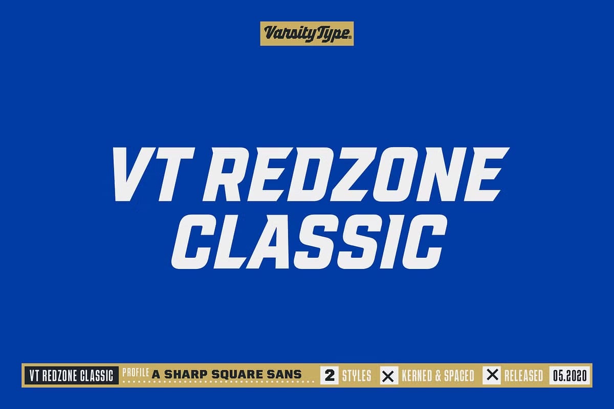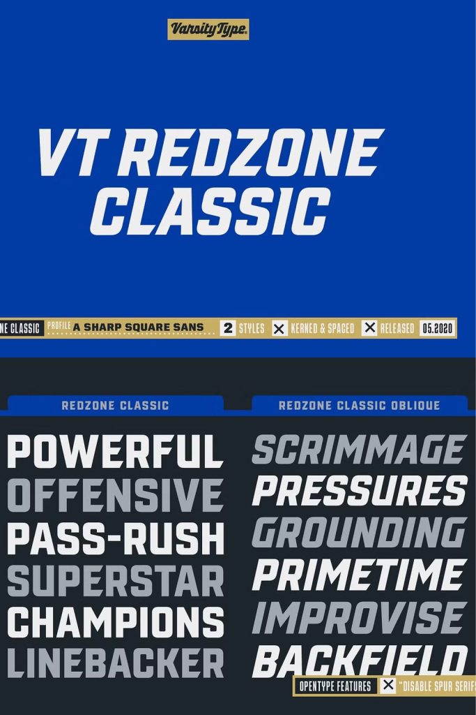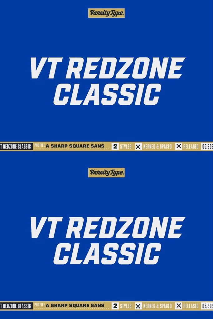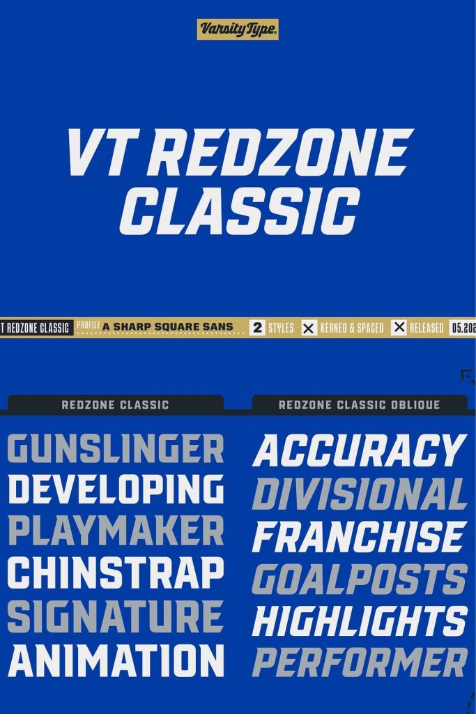Originally released in October 2017, VTF Redzone Classic is the first published typeface by CJ Zilligen. It’s raw and uncut — built with sharp terminals and spur serifs that give off an aggressive appearance. VTF Redzone Classic was refreshed in May 2020 to include nearly 200 new characters, extensive language support, and a sleek and long-anticipated Oblique version. This titlecase display typeface is tooled to give any project a competitive edge.