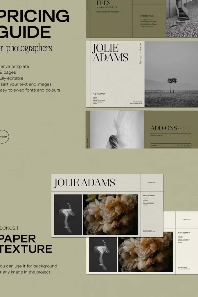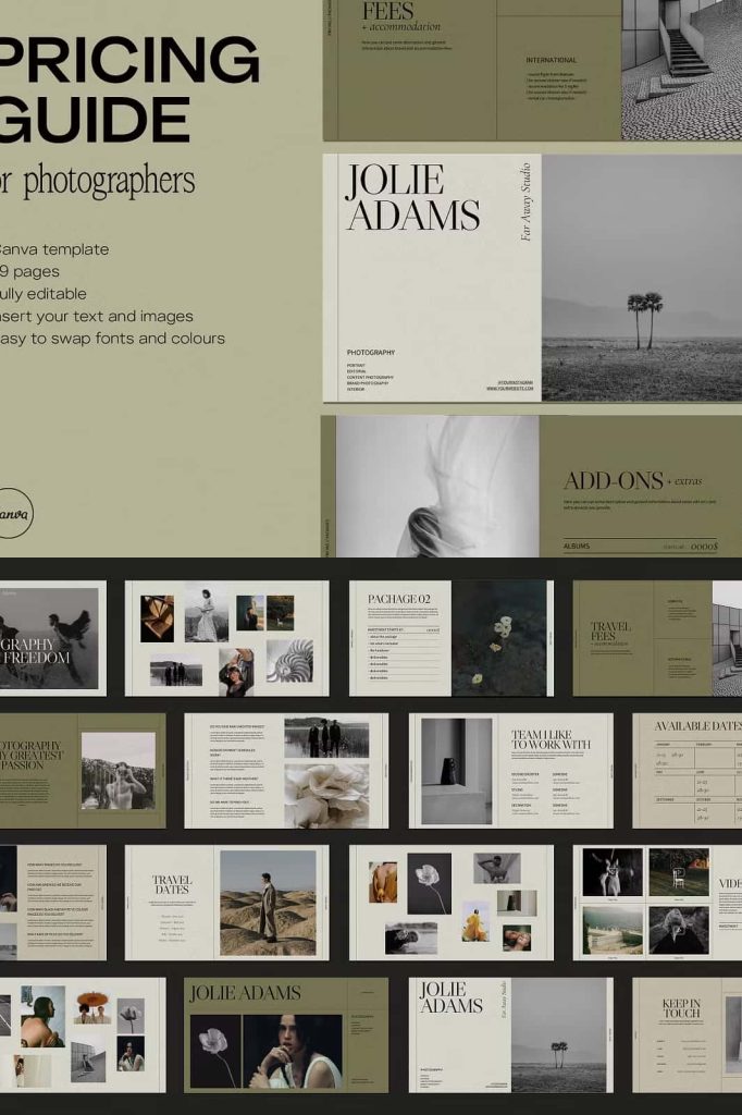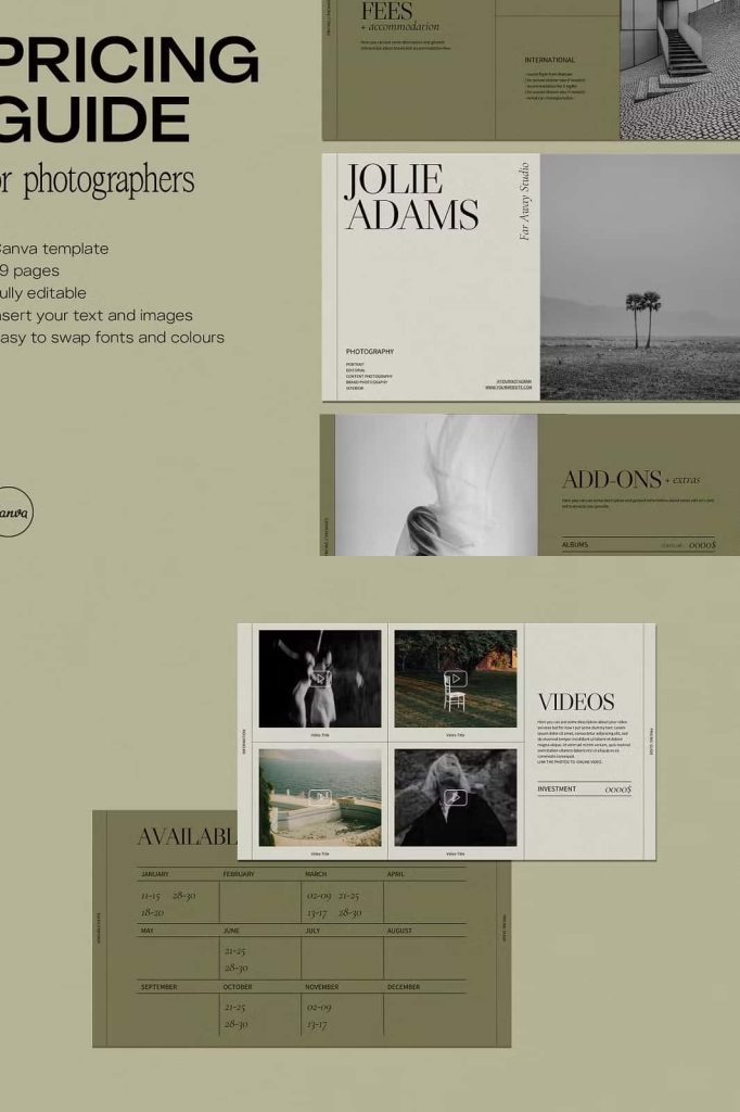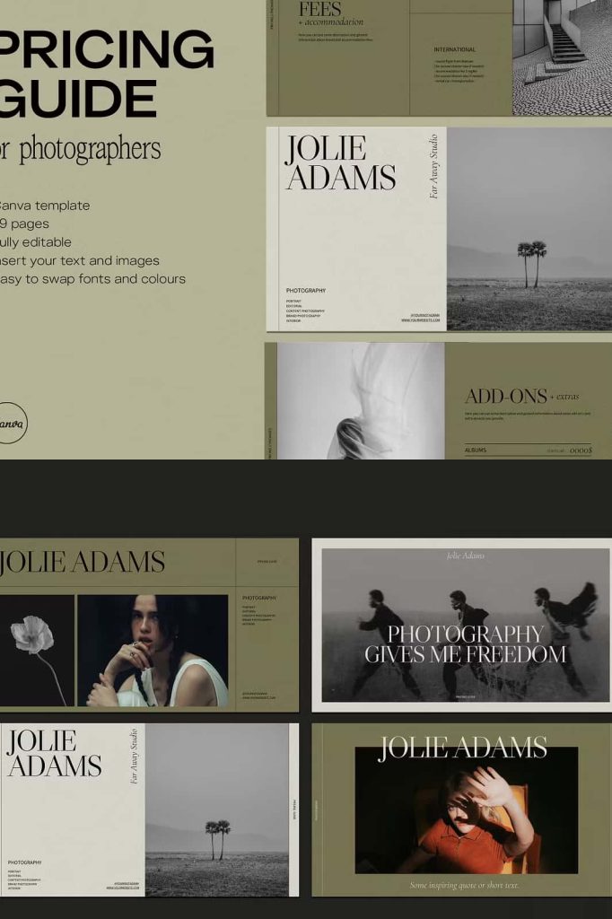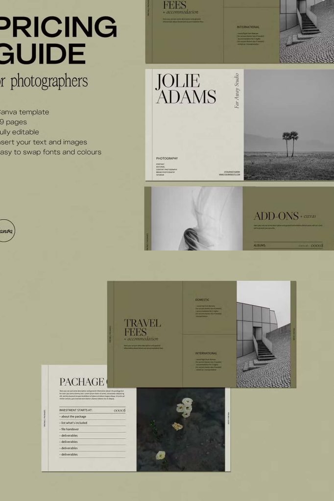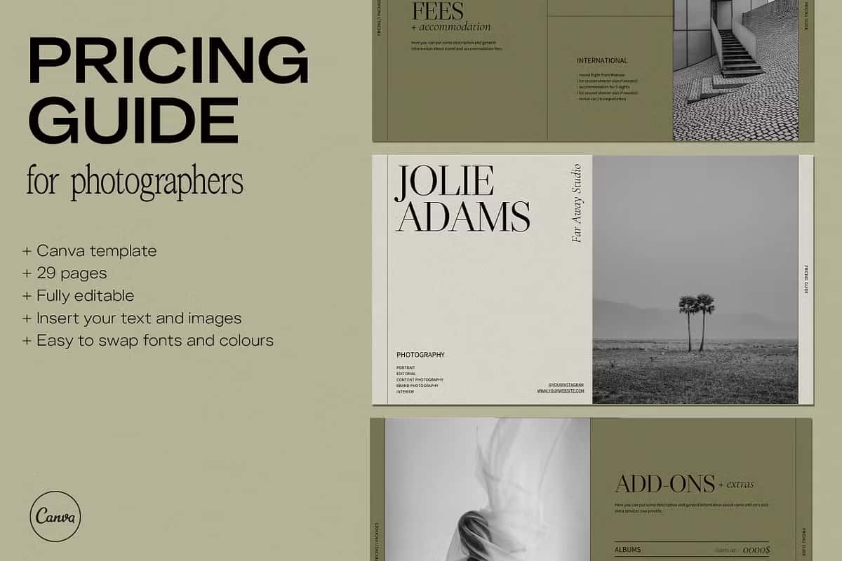 Introducing the JOLIE Pricing Guide for photographers. A strapping 29 pages-worth of professionally designed, fully customisable templates ready to use with Canva for outstanding presentation of your pricing.