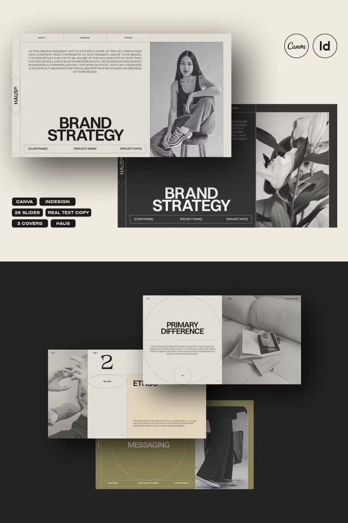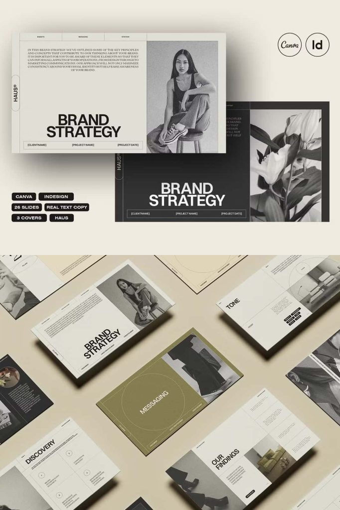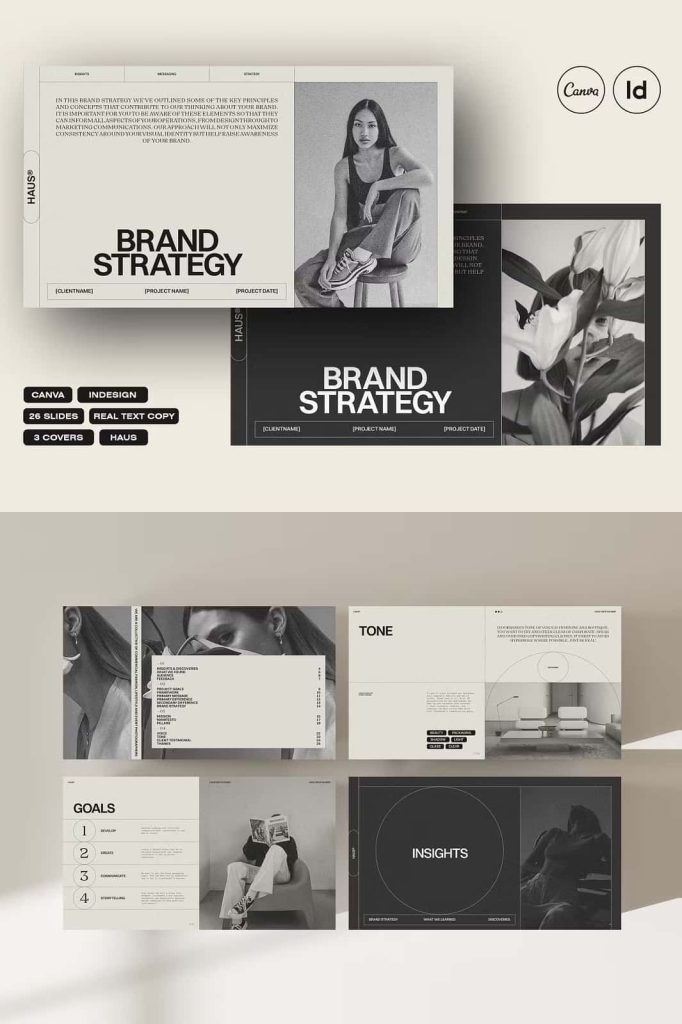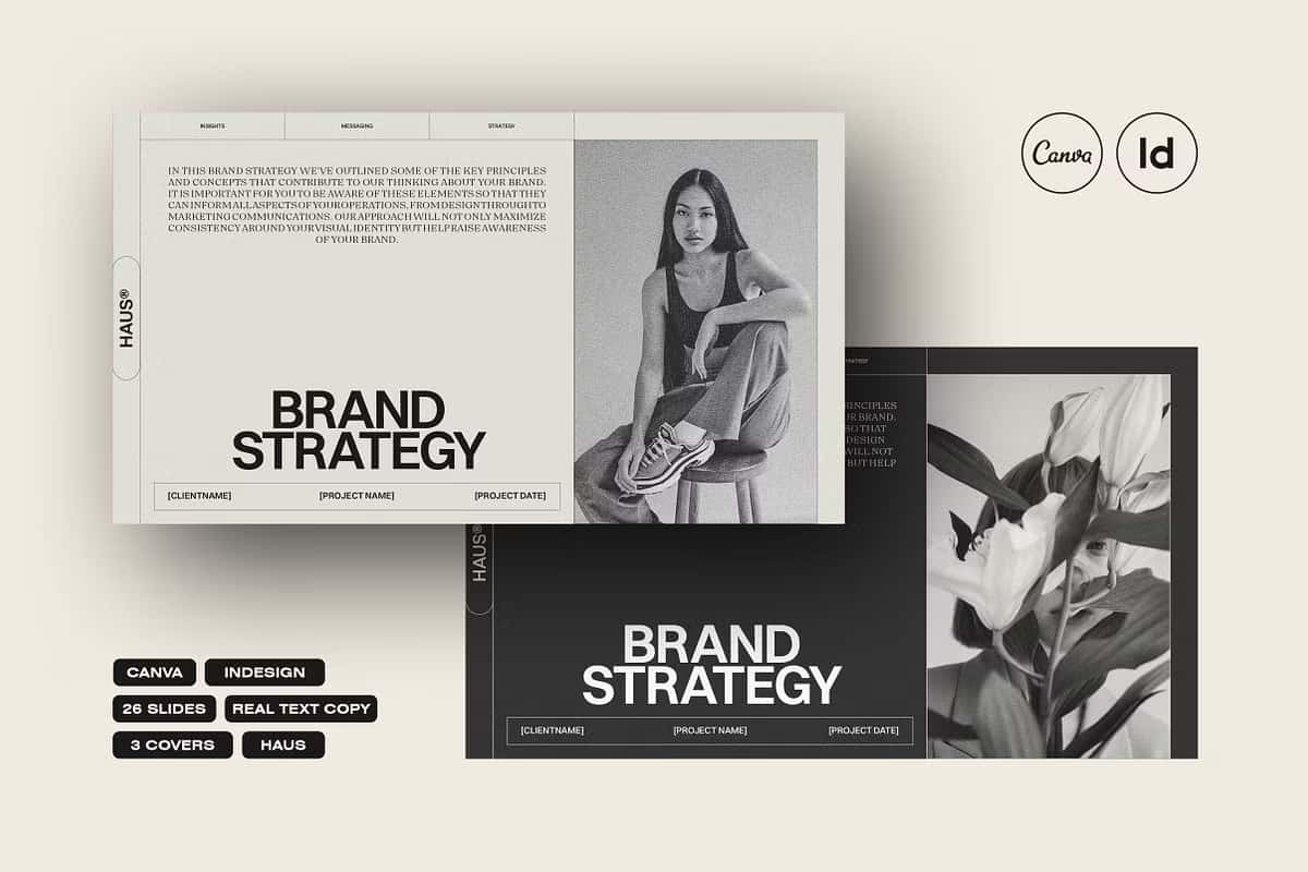 The HAUS | Brand Strategy is a series of 26 fully customizable, beautifully designed slide templates for Canva and Adobe Indesign.