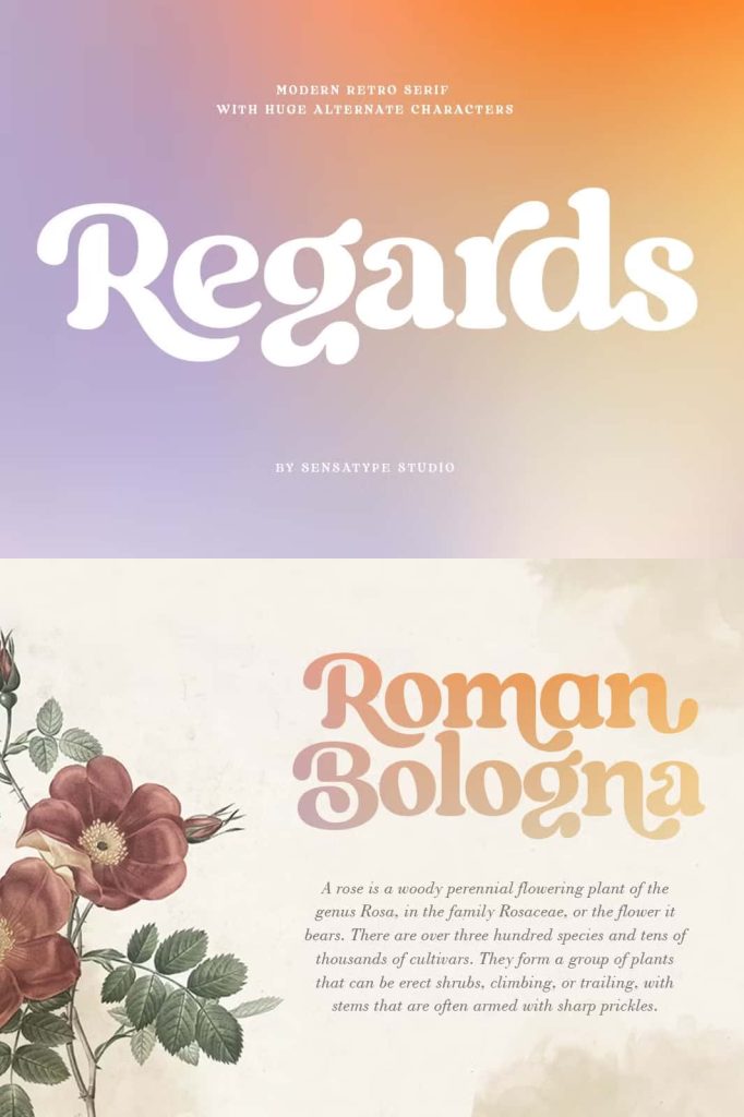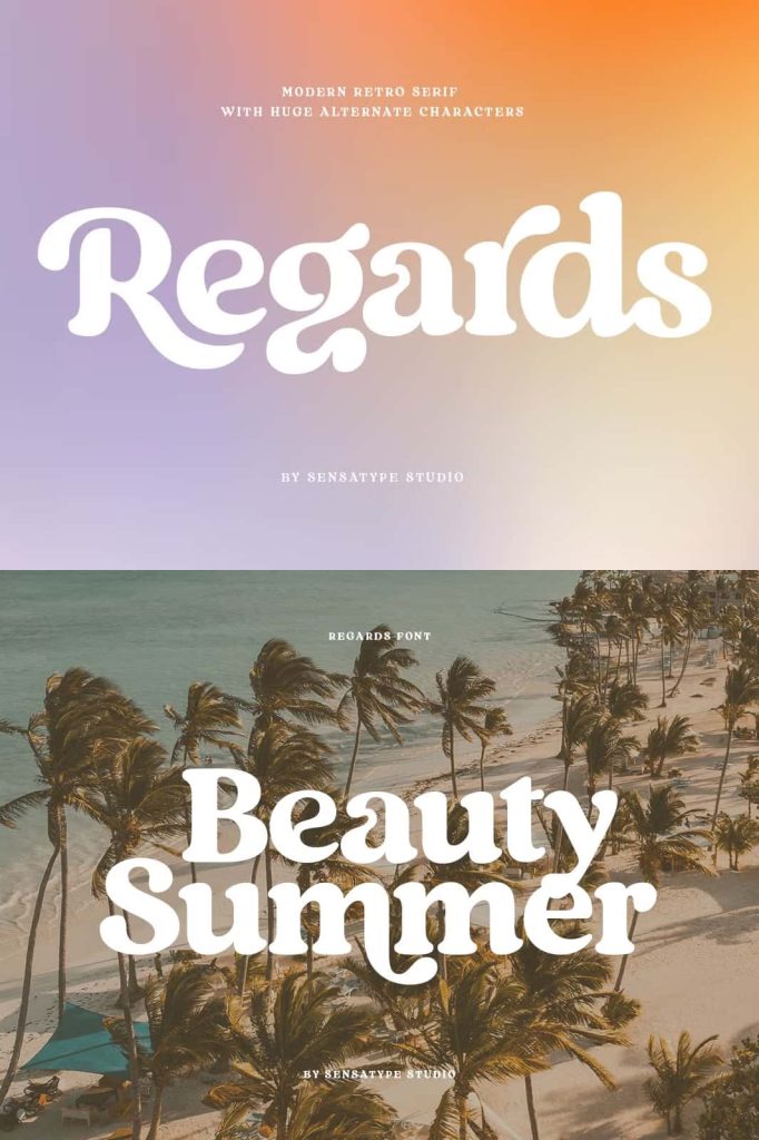 Regards font is a well-balanced retro modern vintage font with a fancy, playful, unique, and versatile vintage serif family with 100+ alternates that you can combine to get curves and beautiful shapes easily just in seconds.